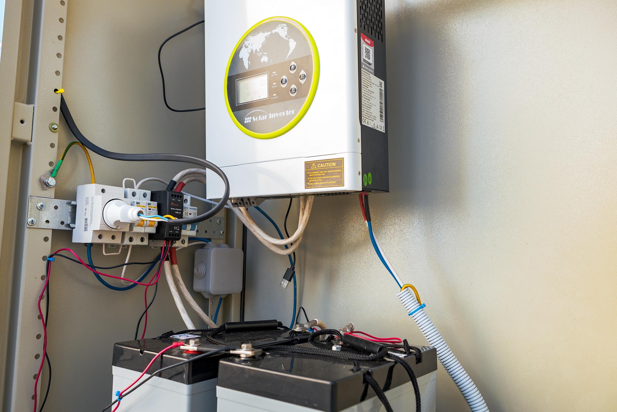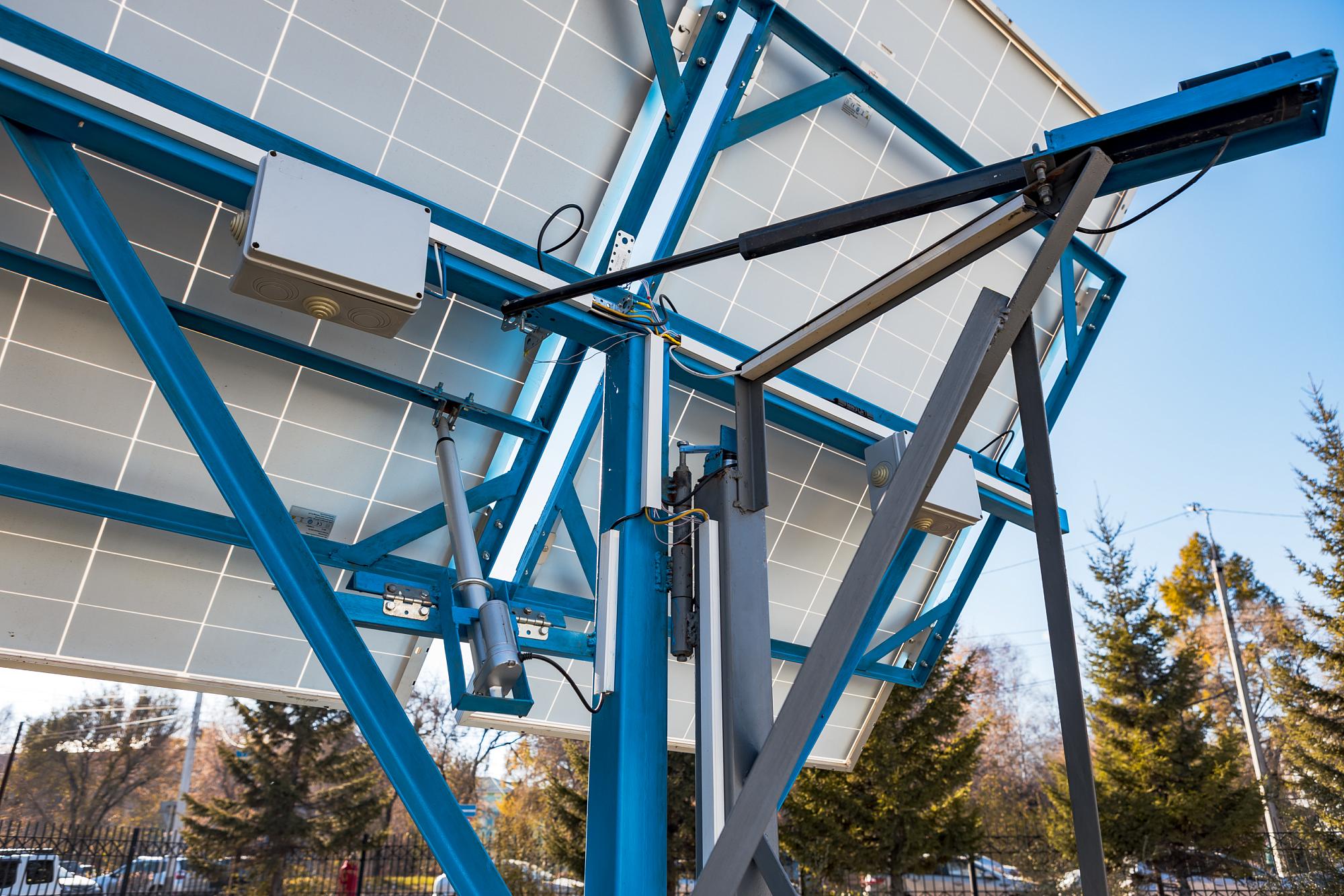 Солнечная электростанция обладает мощностью 880 Вт, состоит из двух солнечных панелей. Они закреплены на подвижной раме, способной менять как угол наклона, так и азимут с помощью линейного привода.