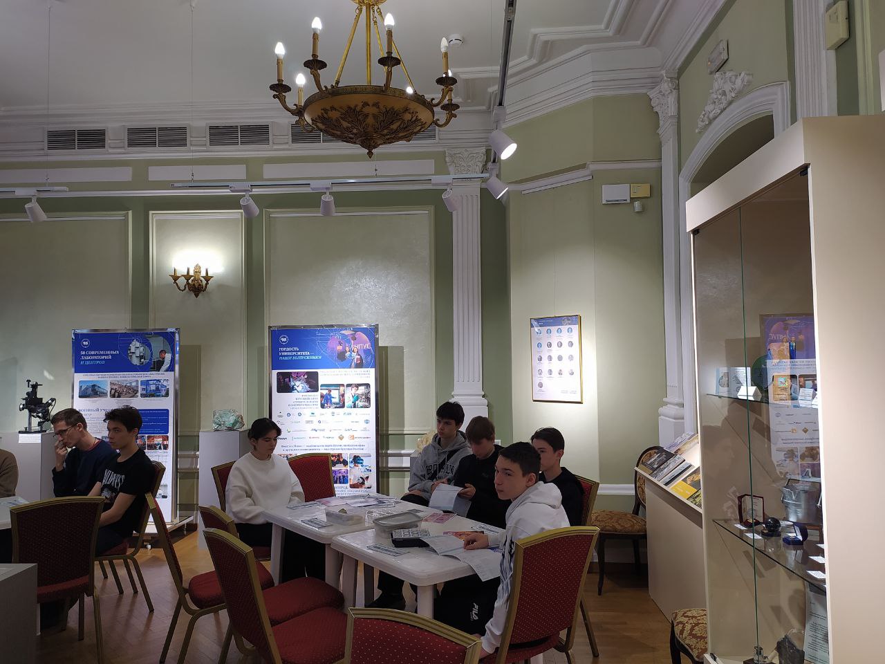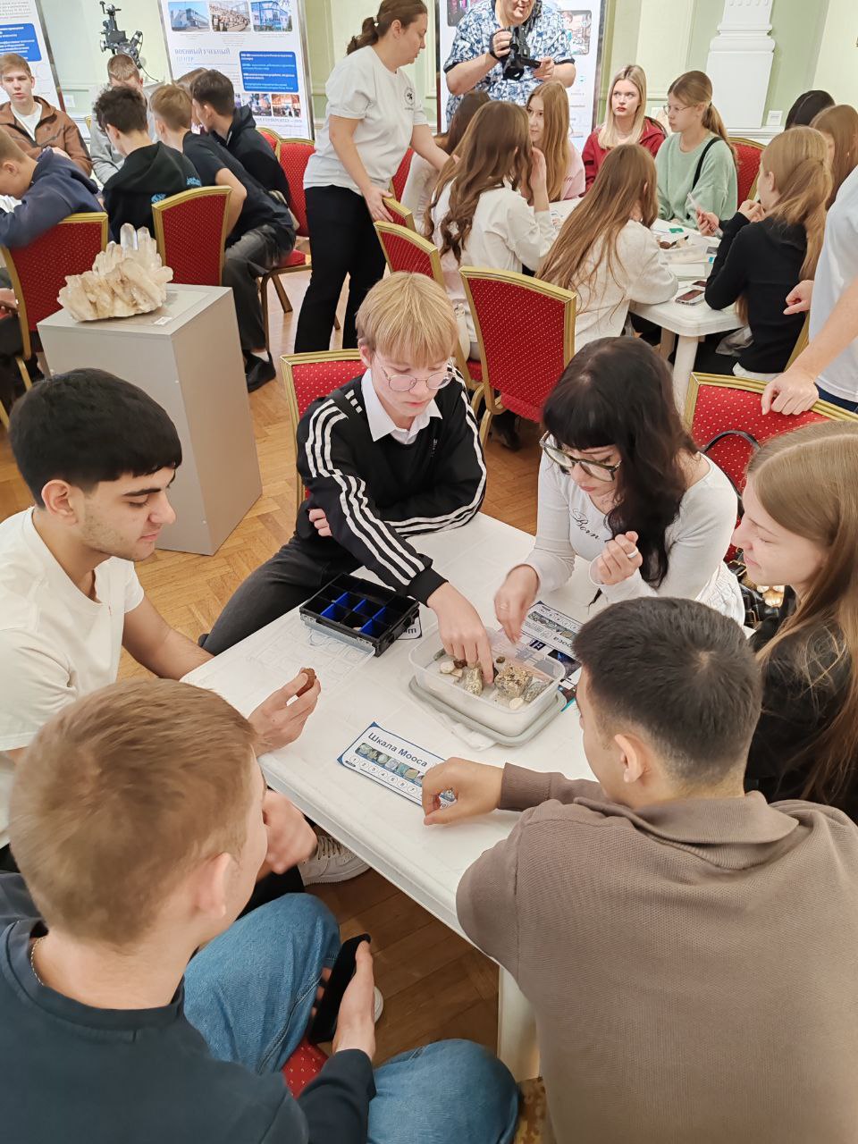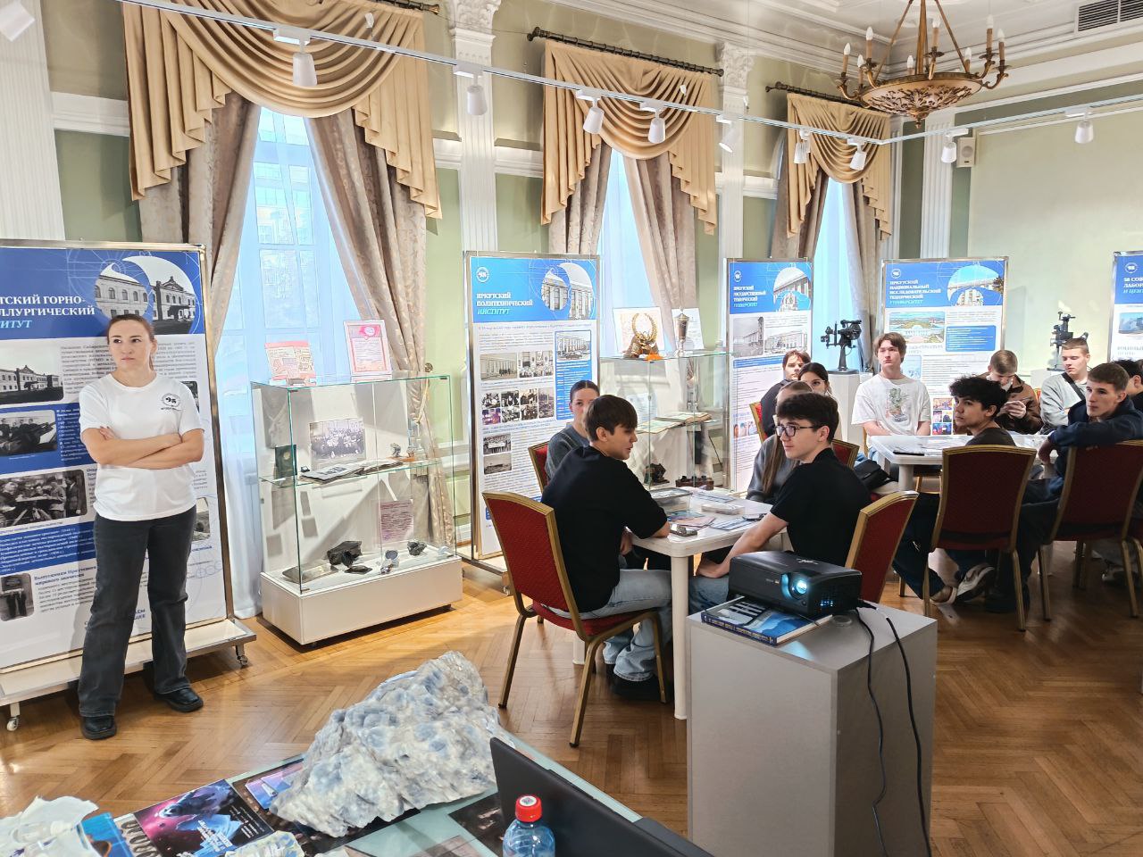 В выставочном зале музея ребята увидели образцы минералов, экспонаты, связанные с историческими событиями или учебой студентов прошлых лет. Школьники узнали и о предприятиях-партнёрах университета, в том числе о тех компаниях, где трудятся выпускники.