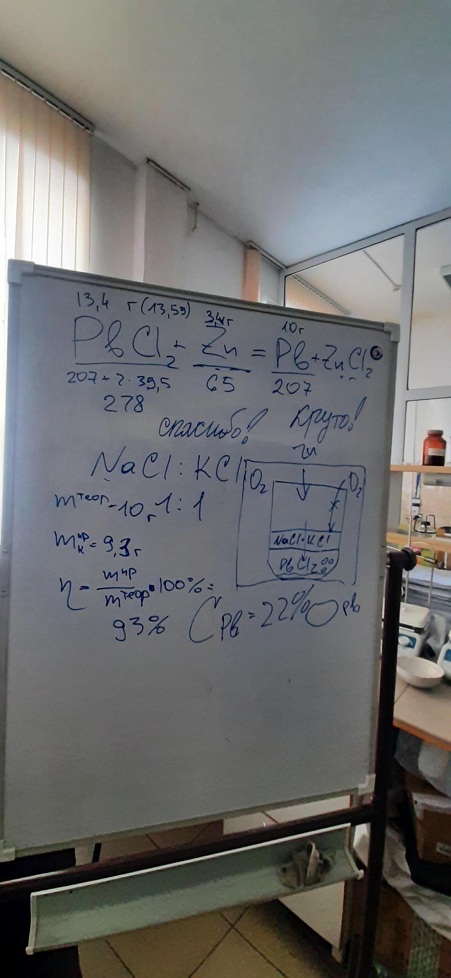 Ребята изучили химическую формулу и узнали, что свинец выделяется при взаимодействии соли хлорида свинца (PbCl2) с цинком, который является восстановителем в данной реакции. Для подготовки шихты – смеси материалов для загрузки в плавильную печь – помимо хлорида свинца используются соли натрия (NaCl) и калия (KCl). Они служат защитным флюсом от окисления (среда в печи содержит кислород О2). Школьники рассчитали количество реагентов по формуле и смешали в тигле. После серии десятиминутных сеансов плавления загрузили гранулированный Zn. В результате химической реакции под воздействием высокой температуры выделяется свинец и копится в нижней части тигля. Затем участники эксперимента подготовили изложницу – форму, заполняемую расплавленным металлом для получения слитка (обработали мелом), в нее вылили расплавленный образец из печи. Для осаждения металла потребовалось примерно 10 минут.