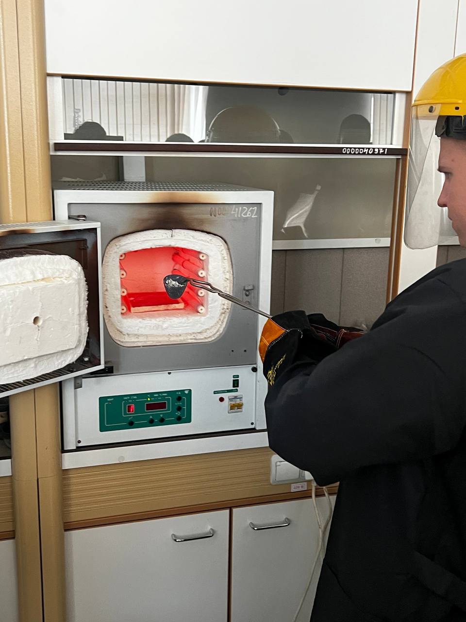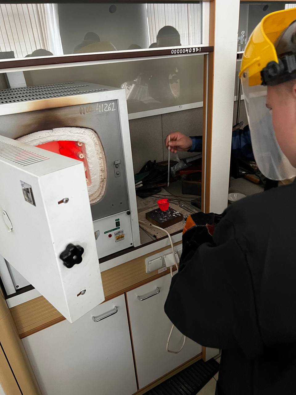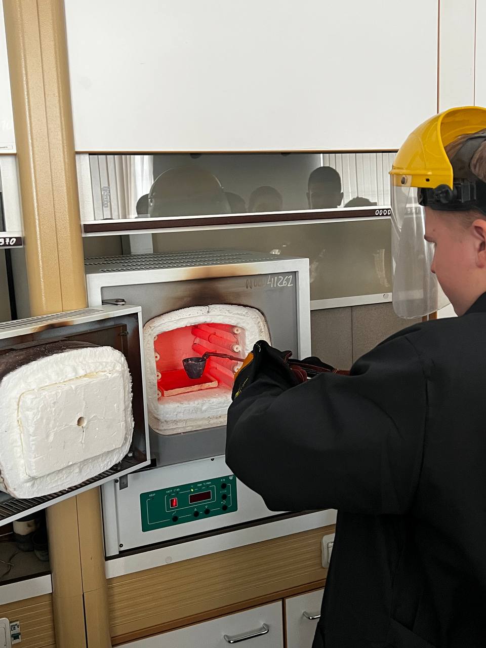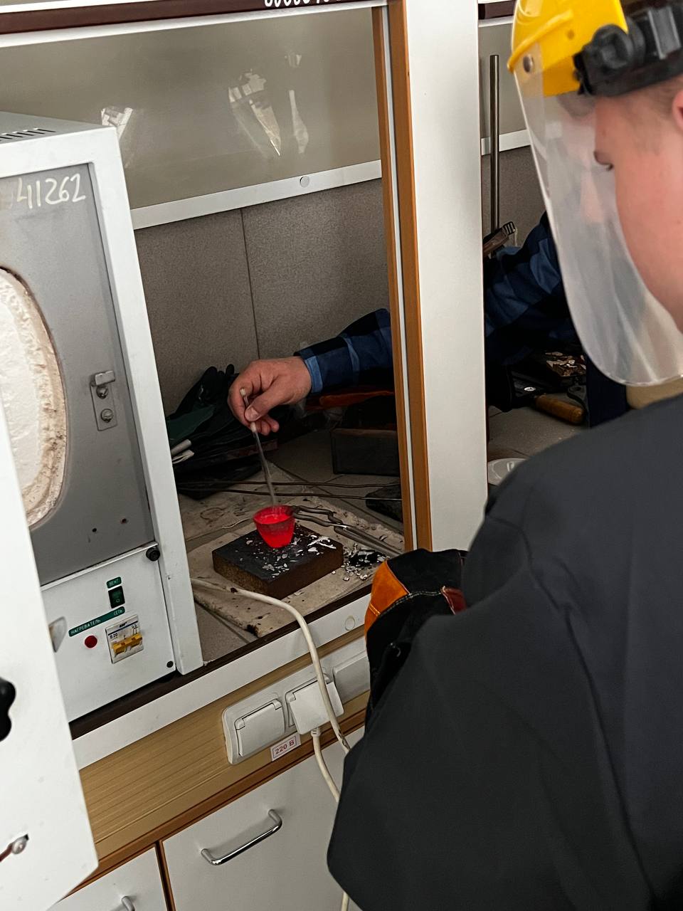 Под руководством преподавателя школьники экспериментировали с металлами, выплавили слиток свинца (Pb) с помощью муфельной печи при температуре 750°C.