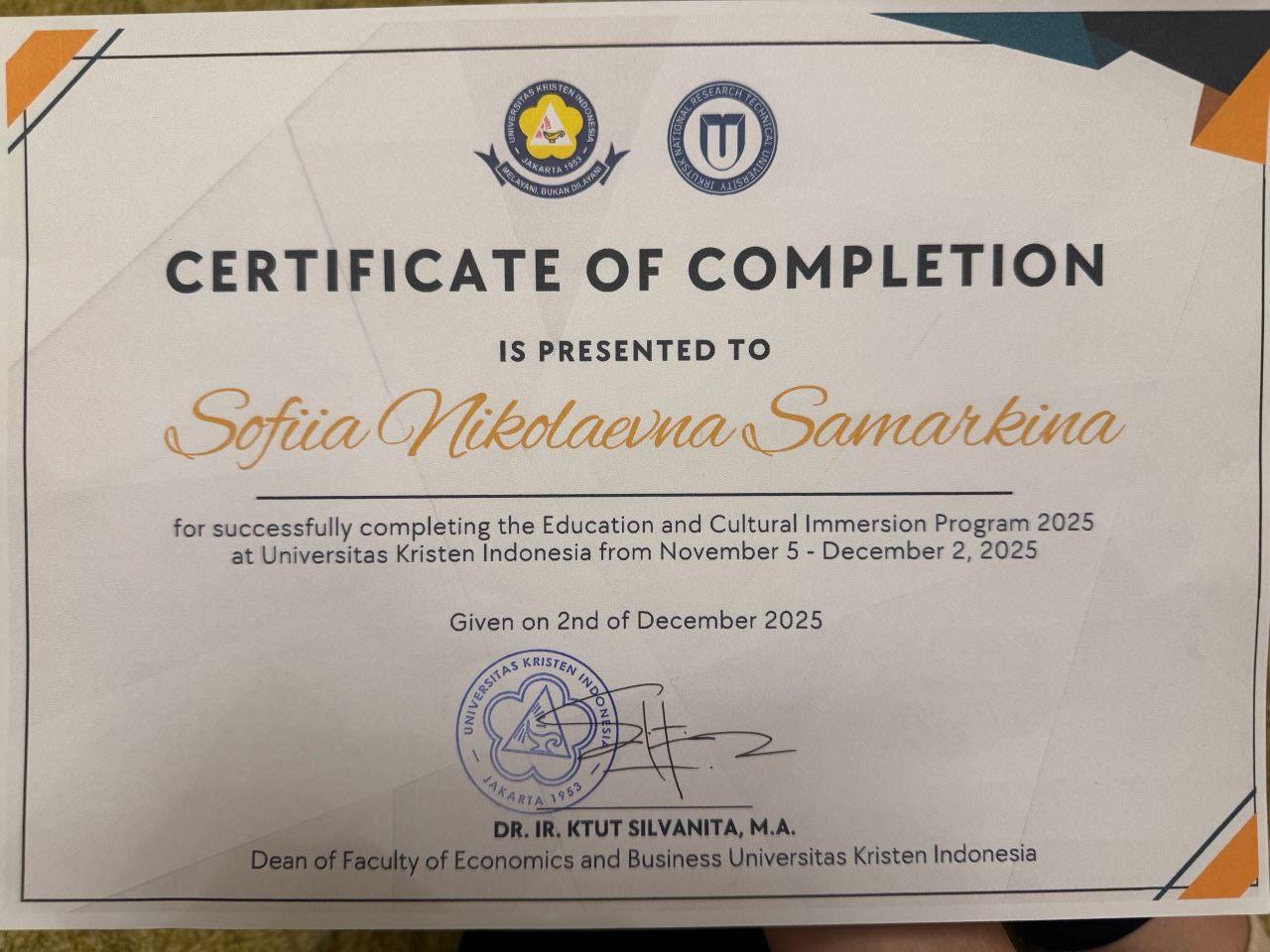 Студентка ИРНИТУ София Самаркина прошла стажировку в Христианском университете Индонезии (Джакарта). В течение месяца она изучала программу по экономике и менеджменту, совершенствовала английский язык и знакомилась с индонезийской культурой.