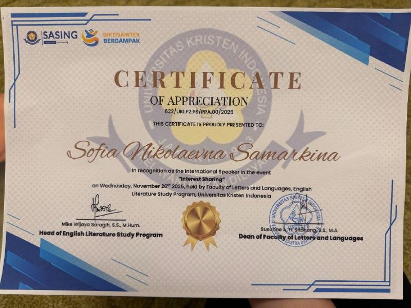 София выступила на встрече, где иностранцы рассказывали о культуре, блюдах и религии своих стран. За этот доклад она получила благодарственное письмо от руководства университета. По субботам София Самаркина брала уроки индонезийского языка. По её словам, это простой язык, где нет времён глаголов, используется латиница. Студентку ИРНИТУ удивило то, что в Индонезии не принято называть друг друга по именам. Вместо этого индонезийцы используют специальные слова или просто произносят по отношению к кому-либо обращения «женщина», «мужчина».