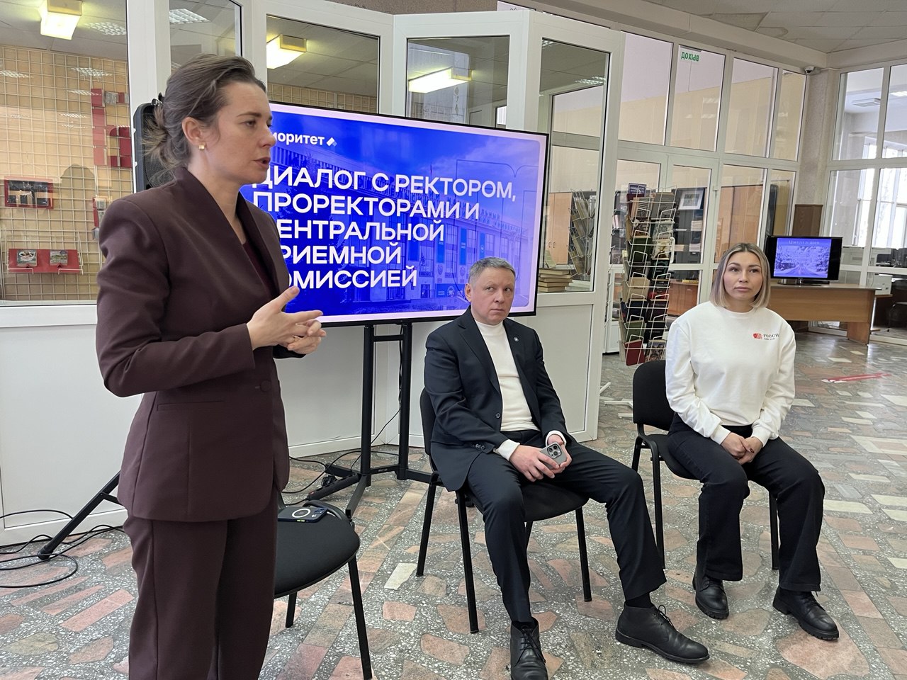В программу мероприятия вошел Диалог с ректором, который был организован в библиотеке. Ректор Михаил Корняков, начальник Управления по работе с абитуриентами Наталия Вострикова и проректор по молодежной политике Дарья Лобанова ответили на вопросы родителей.