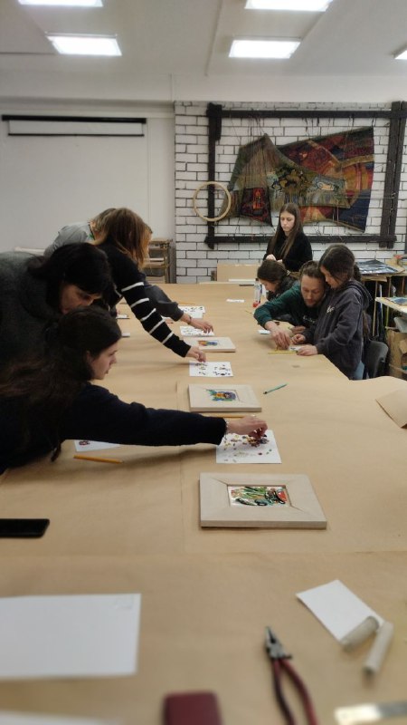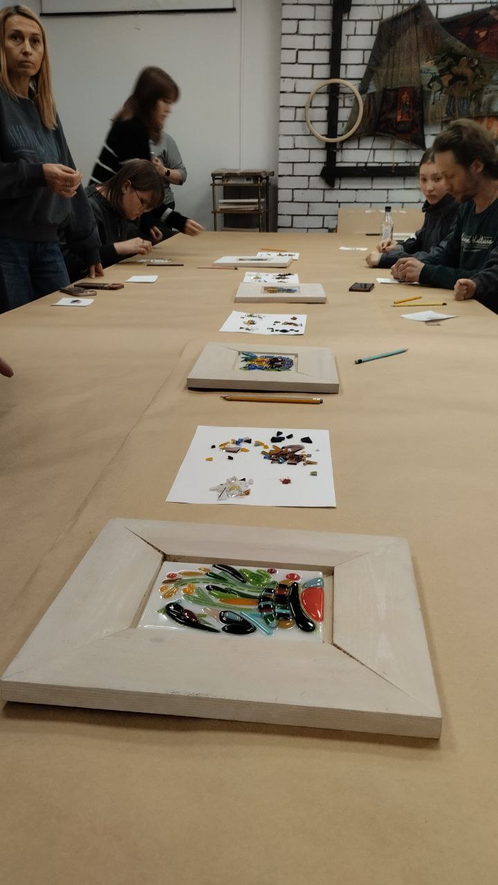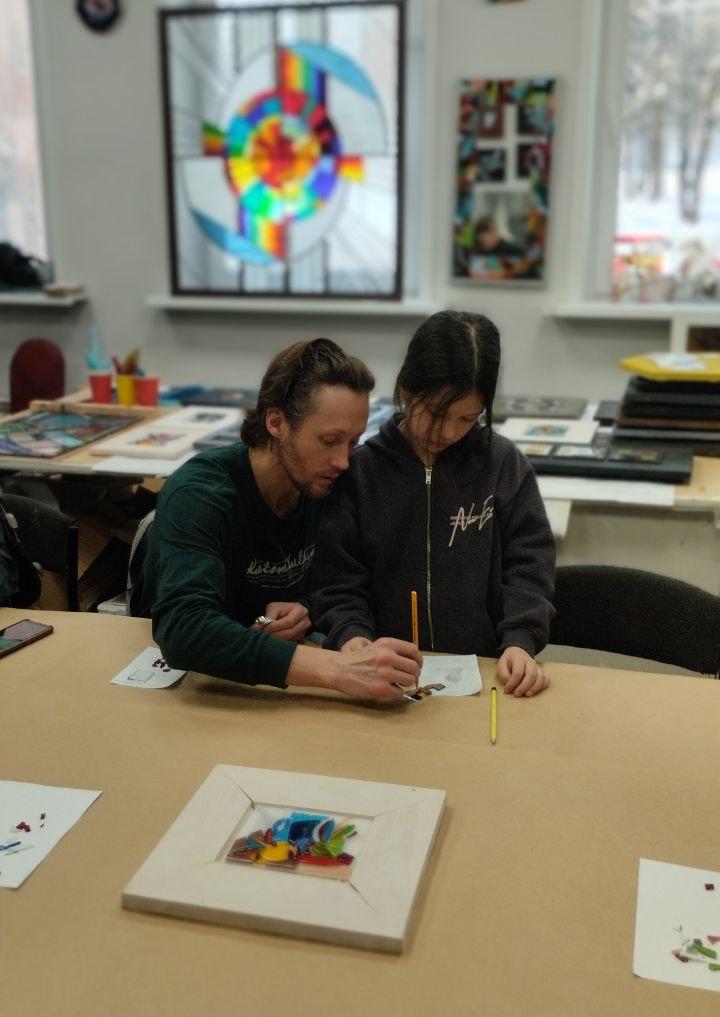 Некоторые школьники отправились в Арт-корпус, чтобы сделать панно из цветного стекла, послушать лекции об искусстве и дизайне и познакомиться с проектами кафедры, где готовят художников-монументалистов.