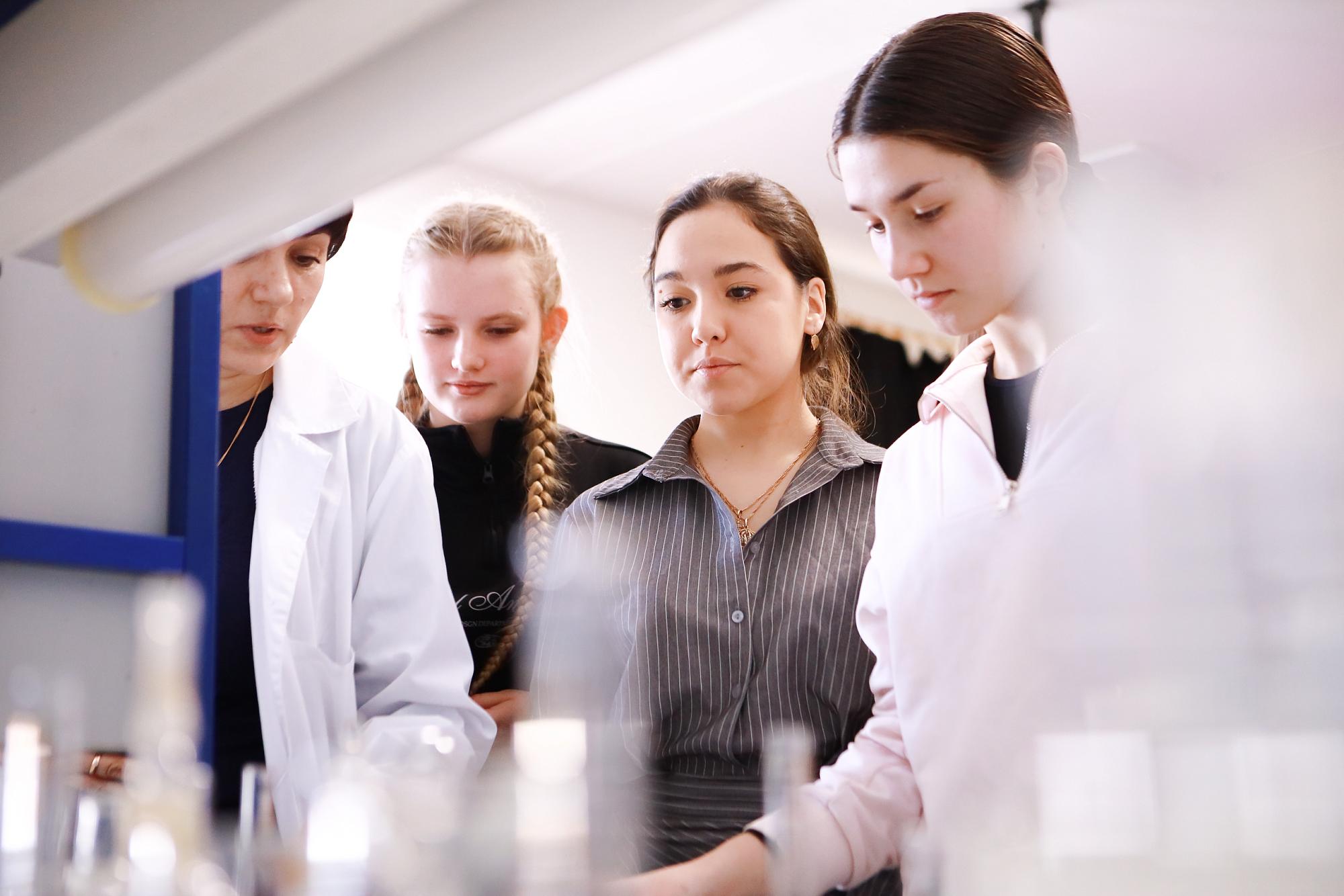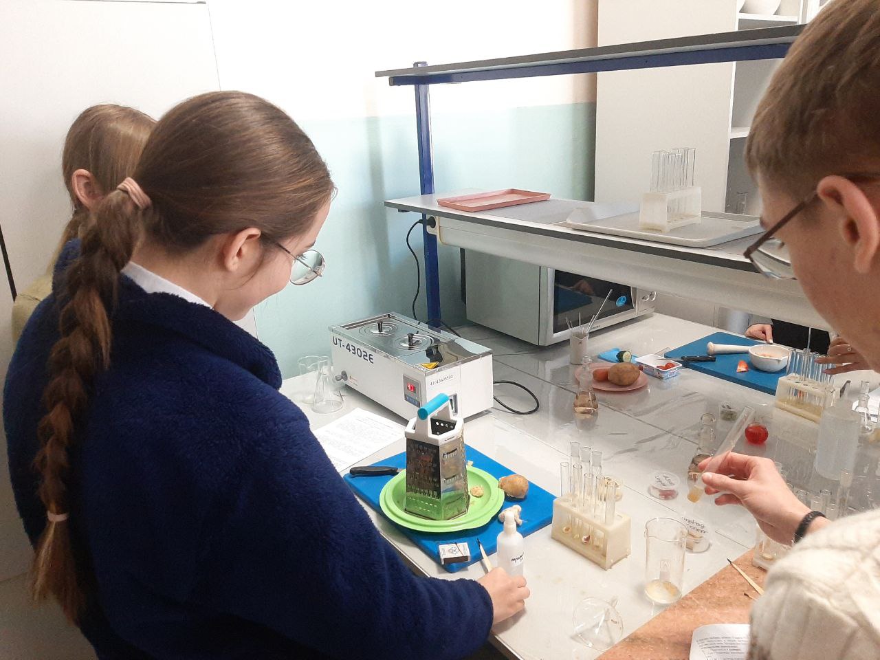 О свойствах ферментов детям рассказали преподаватели кафедры биотехнологии имени В.В. Тутуриной Евгения Сипкина и Татьяна Лозовая. Они предложили ребятам сделать опыты по ферментации. Один из экспериментов позволил определить наличие нитратов в продуктах. Для этого ученики перетёрли в ступке семечки арбуза, а затем разбавили порошок с водой. В результате образовался фермент уреаза, который смешали с овощами. Благодаря индикатору смесь приобрела красноватый оттенок, что указало на присутствие вредных веществ. Также ребята проверяли влияние антибиотика на амилазу, смешивая её с крахмалом.