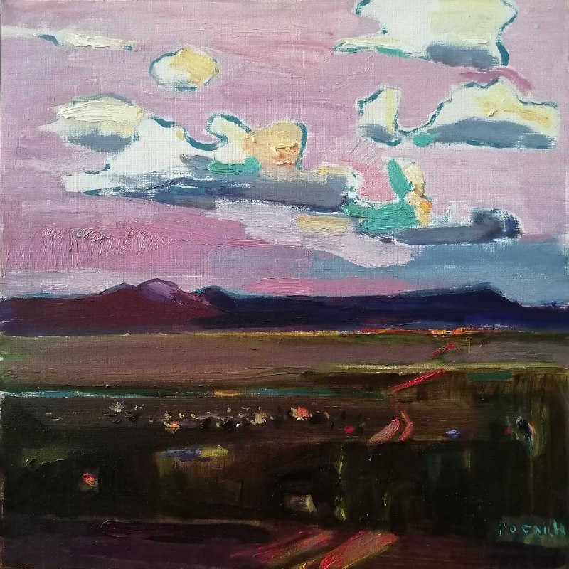Эмоции от увиденного нашли отражение в холсте «Степь». На полотне монгольская степь предстаёт в волшебном свете: розовые облака купаются в лучах заката, а дорога ведет к далёким сопкам. Привычное поле словно оживает алыми всплесками цветов.