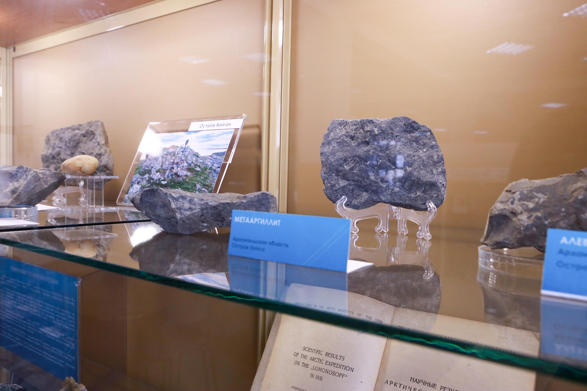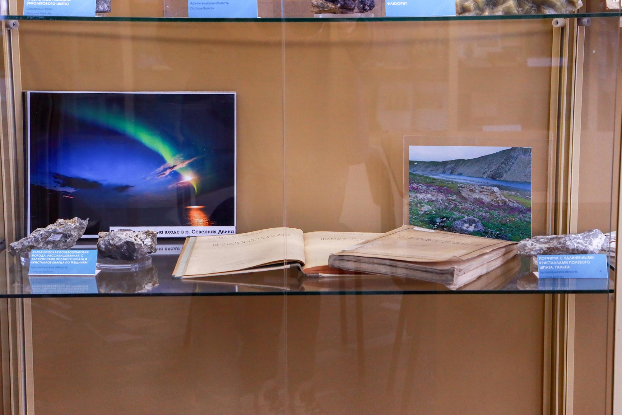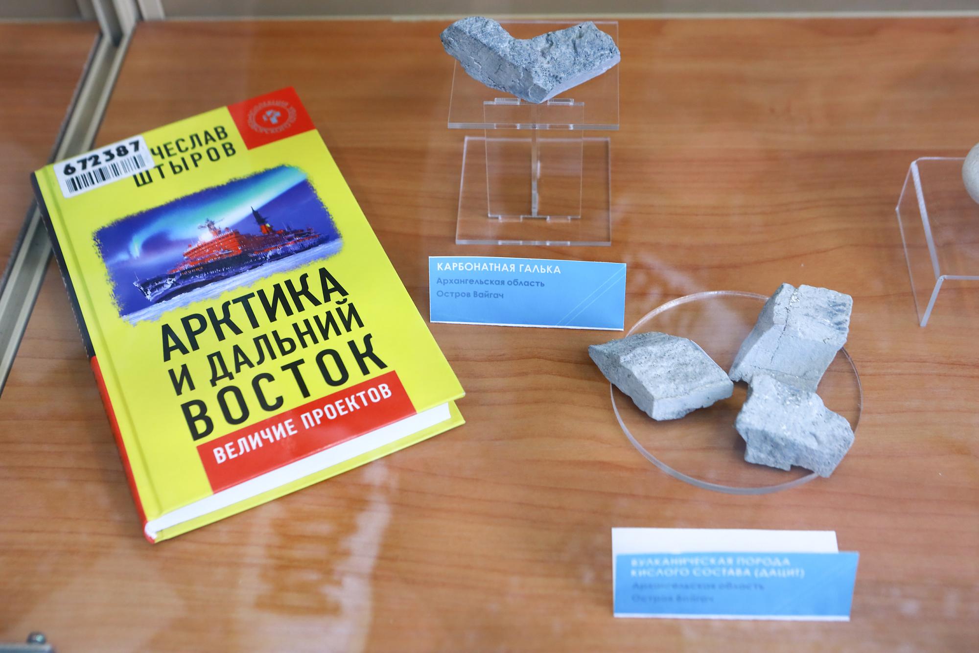 В библиотеке ИРНИТУ представлена экспозиция вузовского Минералогического музея, посвящённая истории освоения Севморпути, уникальной природе и геологическому богатству острова Вайгач. В витринах выставлены минералы и породы острова, архивные материалы, научные публикации и книги, повествующие о ключевых концептах выставки.