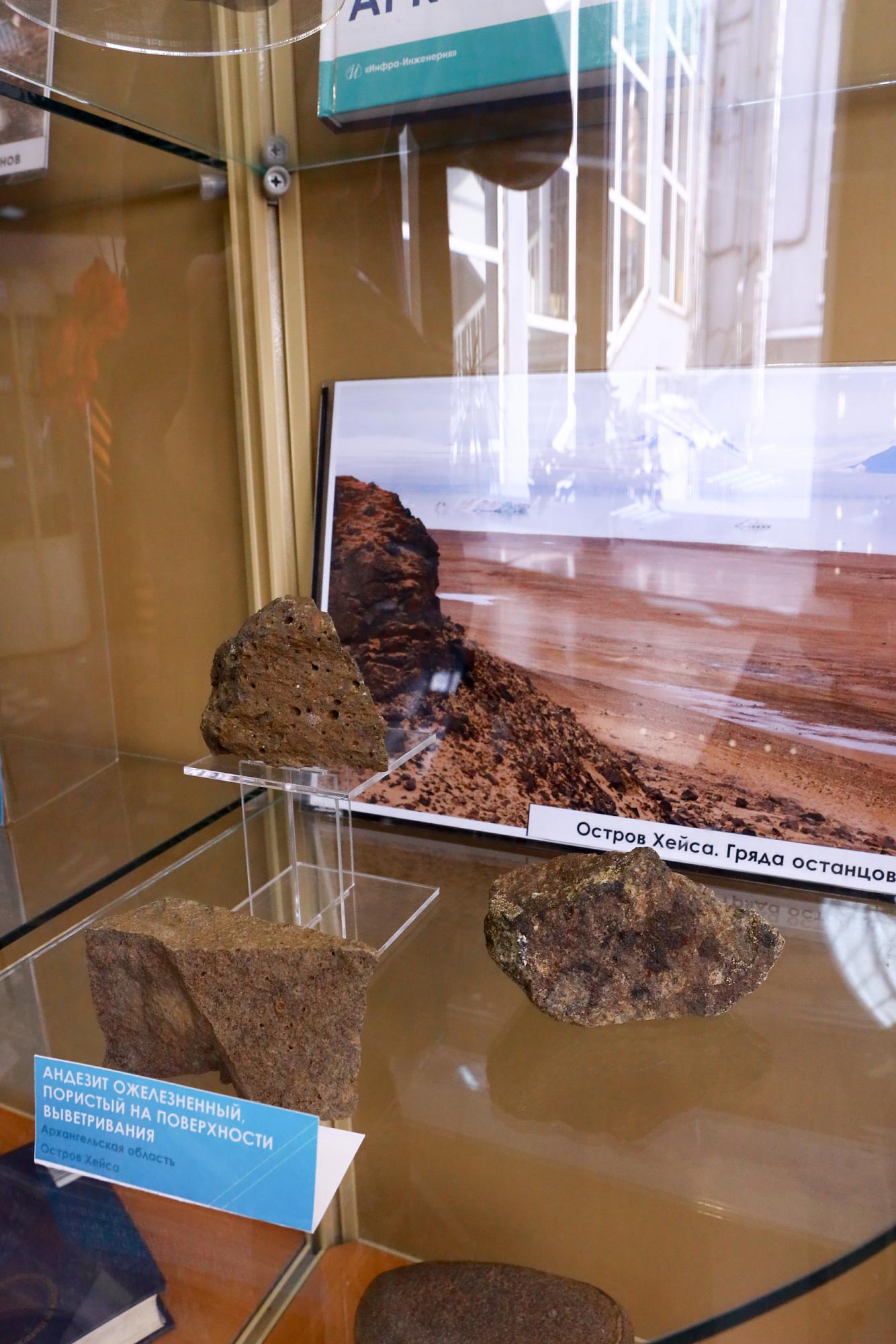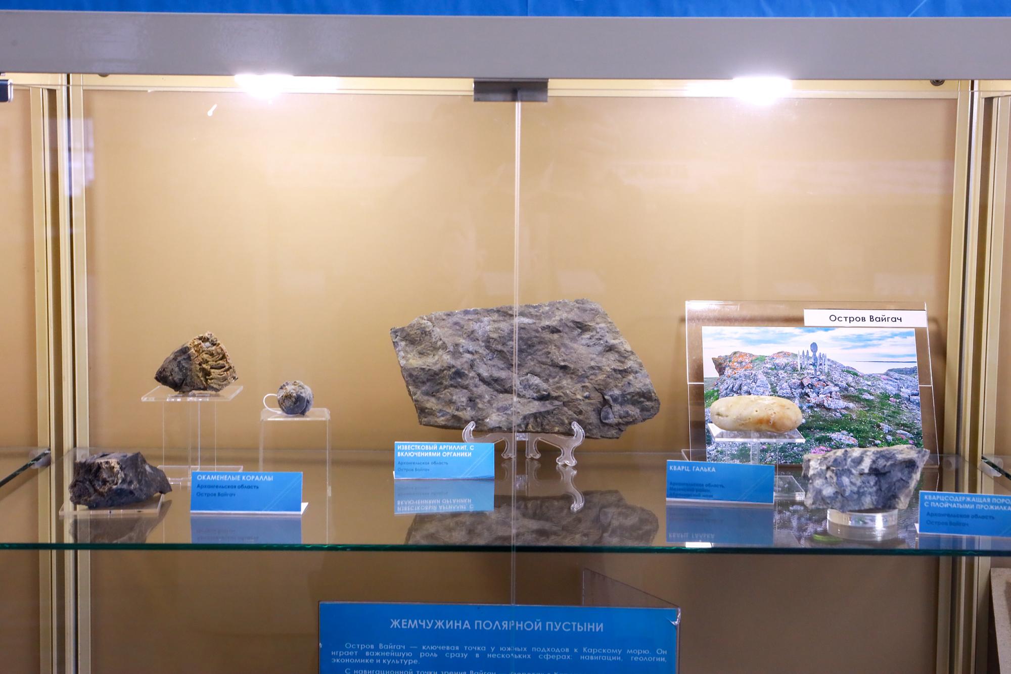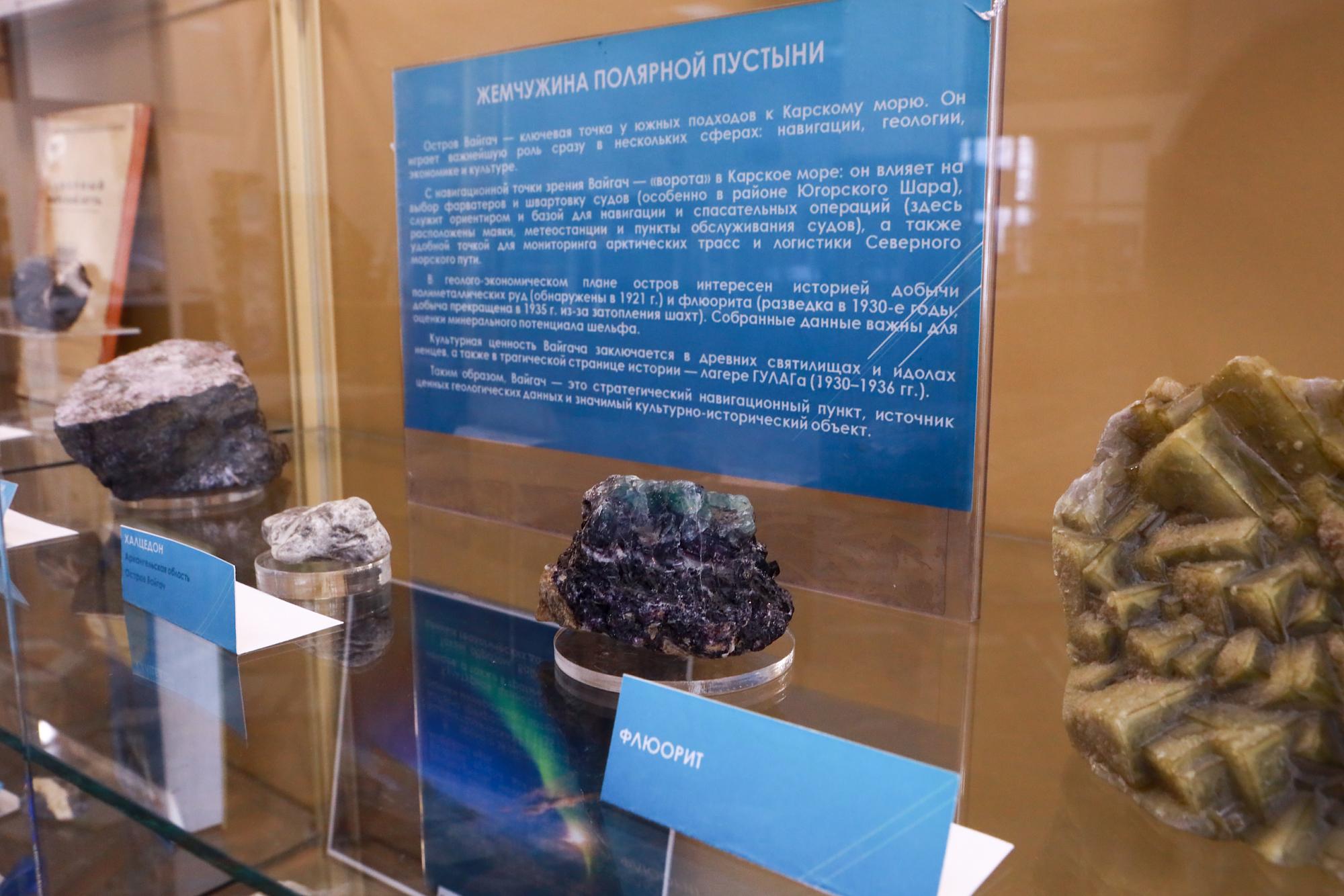 В библиотеке ИРНИТУ представлена экспозиция вузовского Минералогического музея, посвящённая истории освоения Севморпути, уникальной природе и геологическому богатству острова Вайгач. В витринах выставлены минералы и породы острова, архивные материалы, научные публикации и книги, повествующие о ключевых концептах выставки.