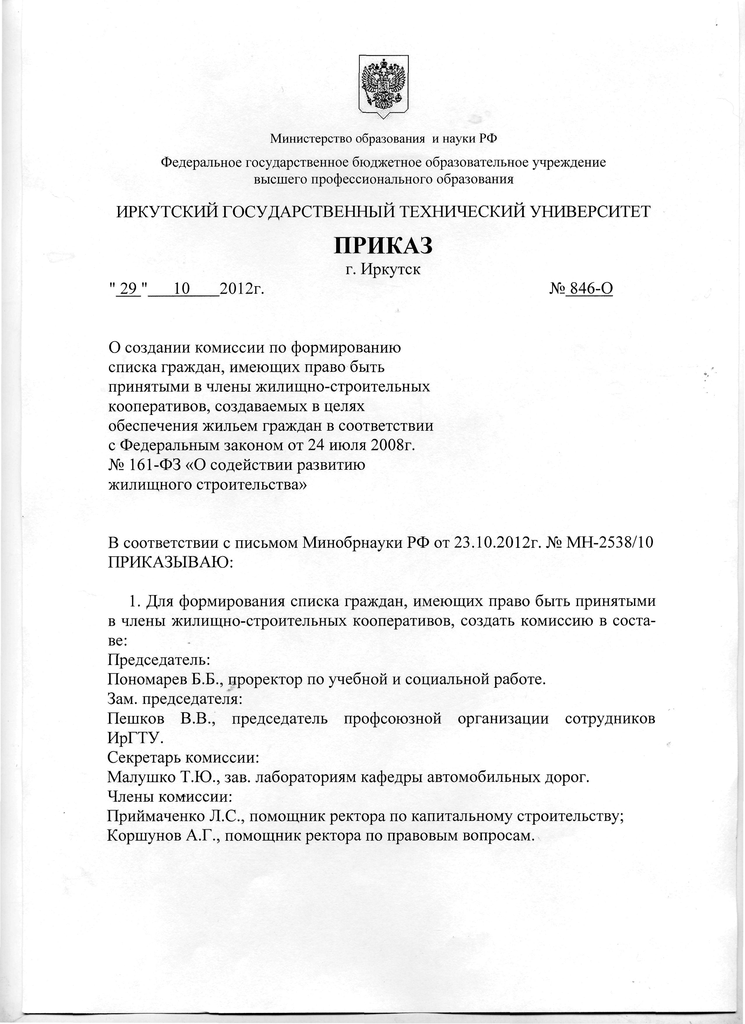 - Приказ №846-О от 29.10.2012 О создании комиссии по формированию списка граждан, имеющих право быть принятыми в члены жилищно-строительных кооперативов, создаваемых в целях обеспечения жильем граждан в соответствии с Федеральным законом