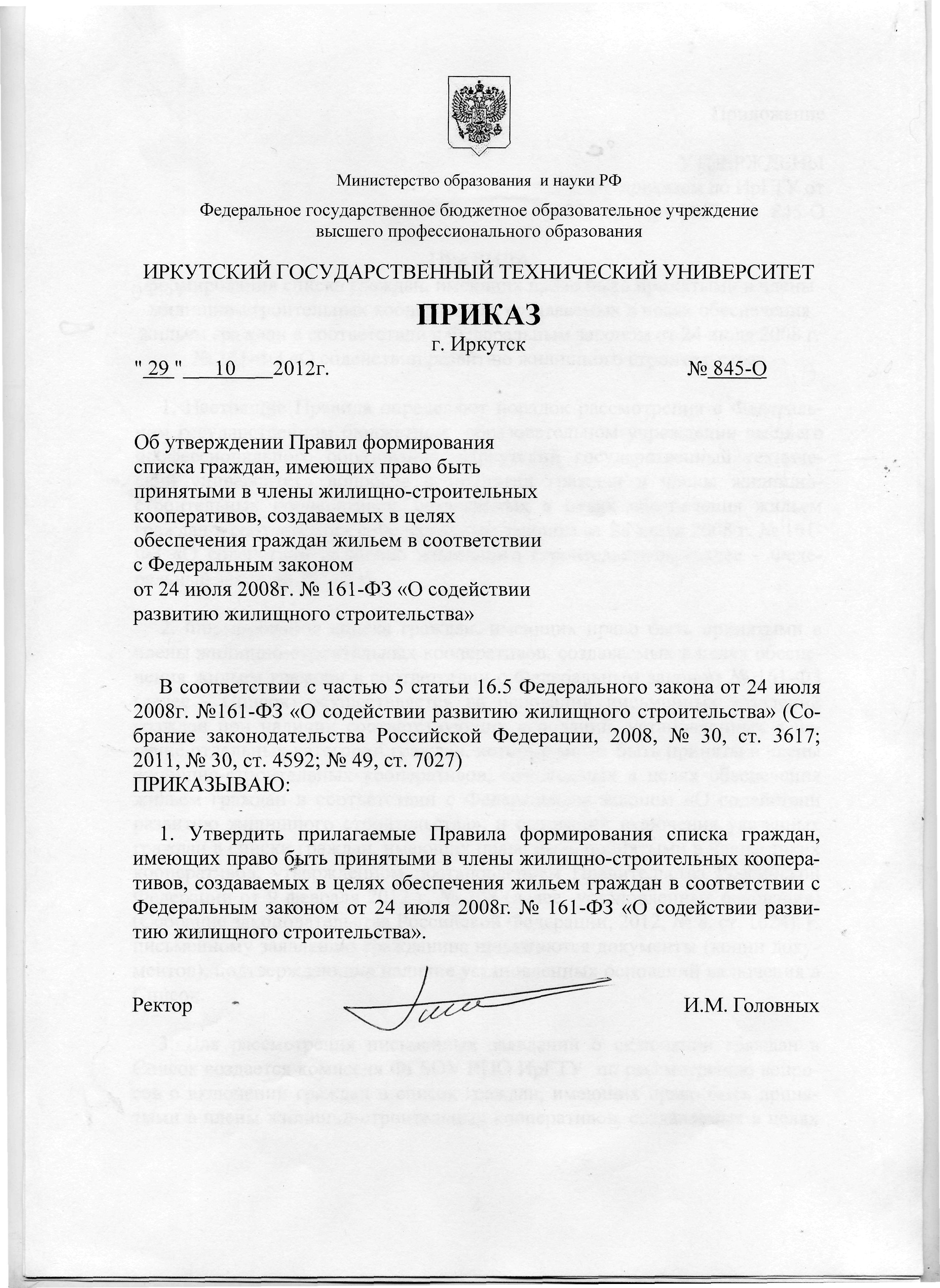 - Приказ №845-O от 29.10.2012 Об утверждении Правил формирования списка граждан, имеющих право быть принятыми в члены жилищно-строительных кооперативов, создаваемых в целях обеспечения жильем граждан в соответствии с Федеральным законом от 24 июля 2008 г. №161-ФЗ "О содействии развити
