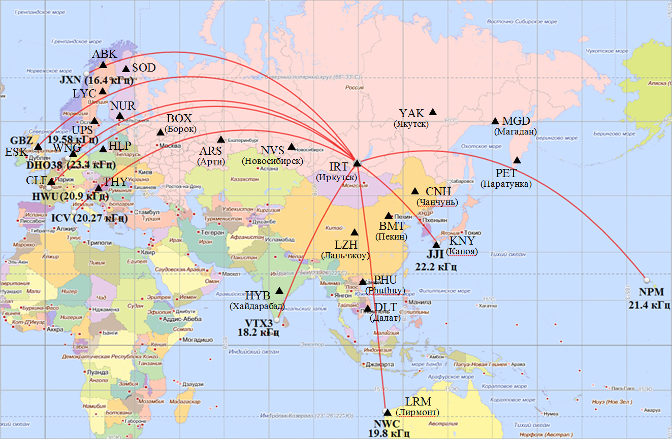 Карта с трассами распространения регистрируемых СДВ радиосигналов